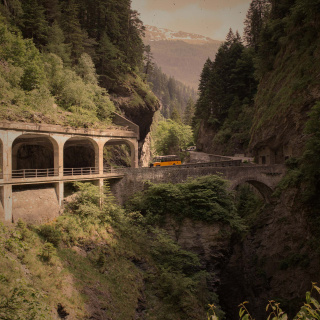 Der moderne Transitverkehr durchquert die einstmals gefährliche Schluchtenlandschaft auf der Autostrasse A13 in wenigen Minuten. Wir nehmen uns Zeit, die Passage auf der kühn angelegten historischen Kunststrasse zu bereisen, und entdecken die Region im Panoramablick des Oldtimer-Postautos aus anderer Perspektive.